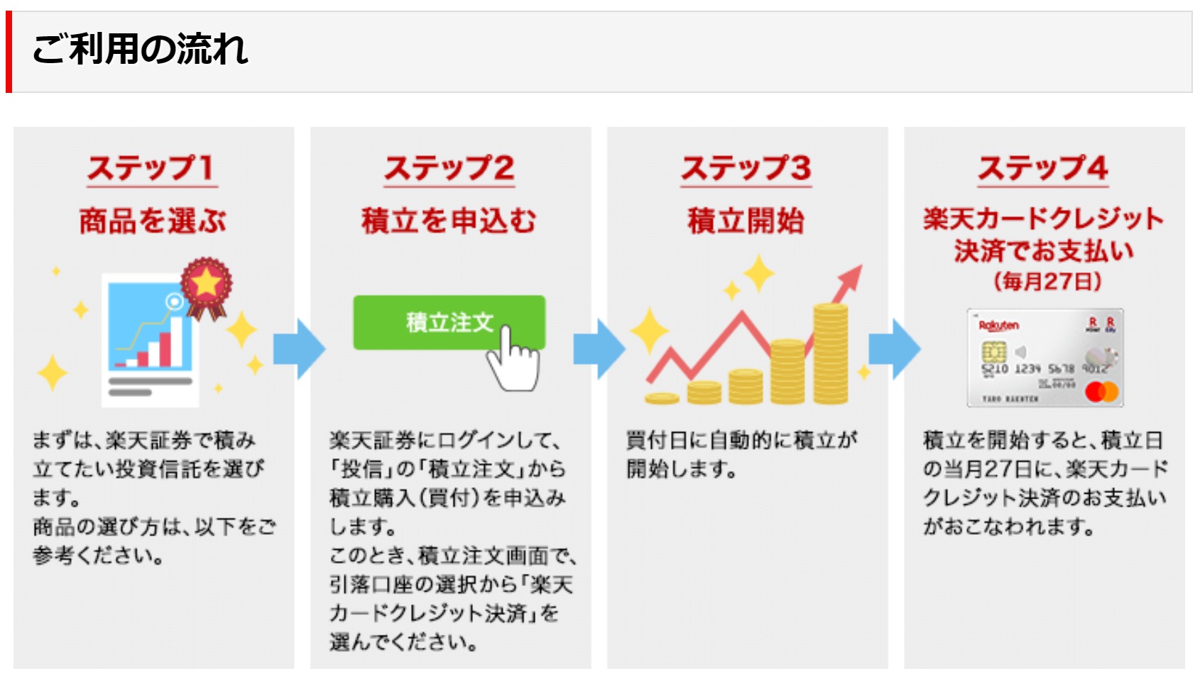 画面が分かりやすく、手続きもとっても簡単♪最初だけ設定すればあとは毎月決まった日に積立されるので手をかける時間は無し!